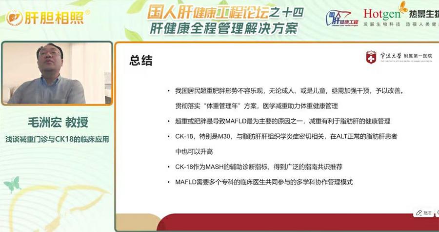 寧波大學(xué)附屬第一醫(yī)院內(nèi)分泌科毛洲宏教授在會(huì)議上圍繞“減重門診與CK18的臨床應(yīng)用”作專題報(bào)告,強(qiáng)調(diào)國家衛(wèi)健委“體重管理年”政策推動(dòng)下,醫(yī)療機(jī)構(gòu)需加強(qiáng)減重門診建設(shè),為超重及肥胖人群提供專業(yè)化服務(wù)。毛教授也以本院“肥胖俱樂部”在開設(shè)近十年的真實(shí)經(jīng)驗(yàn),給我們科普了減重管理的重要性。目前,我國超重肥胖形勢嚴(yán)峻,超50%成人存在體重異常,肥胖與代謝相關(guān)脂肪性肝?。∕AFLD)密切相關(guān),約20% MAFLD患者可能進(jìn)展為脂肪性肝炎(MASH),T2DM患者合并MAFLD比例高達(dá)65.04%。毛教授指出,傳統(tǒng)檢測手段如ALT、B超在早期診斷MASH及纖維化中存在局限性,而細(xì)胞角蛋白18(CK-18)片段作為新型生物標(biāo)志物,通過M30/M65片段可無創(chuàng)評估肝細(xì)胞凋亡與壞死,其敏感性與特異性顯著優(yōu)于傳統(tǒng)指標(biāo)。此外,MAFLD需多學(xué)科協(xié)作管理,結(jié)合減重、改善代謝、抗纖維化等綜合干預(yù)措施,定期監(jiān)測高危人群。毛教授總結(jié)稱,CK18的應(yīng)用將推動(dòng)MAFLD精準(zhǔn)診療,而政策支持與多學(xué)科模式普及,為肥胖及相關(guān)代謝疾病防控注入新動(dòng)力。