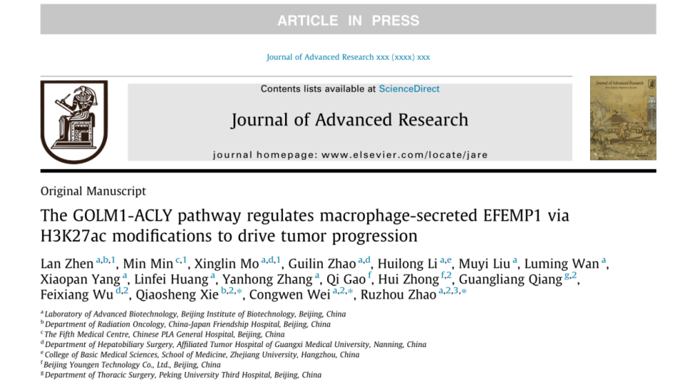 近日,熱景生物參股公司北京堯景基因技術有限公司(簡稱“堯景基因”)聯(lián)合北京生物技術研究所、中日友好醫(yī)院、廣西醫(yī)科大學附屬腫瘤醫(yī)院等多家單位,在《Journal of Advanced Research》雜志發(fā)表重要研究成果,論文題為《The GOLM1-ACLY pathway regulates macrophage-secreted EFEMP1 via H3K27ac modifications to drive tumor progression》。該研究首次闡明巨噬細胞中 GOLM1-ACLY 軸通過表觀遺傳調(diào)控與細胞間信號傳導影響腫瘤進展的分子機制,為癌癥治療提供了全新潛在靶點。