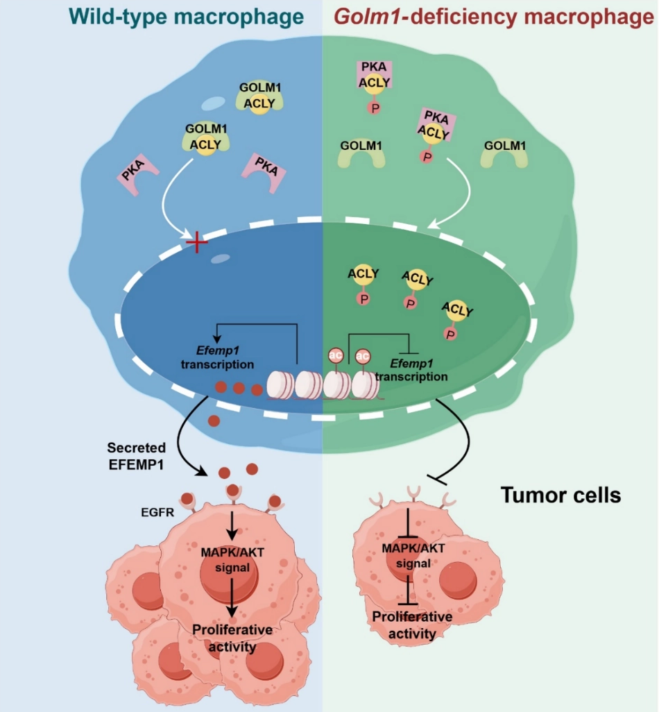 研究結果表明,GOLM1 在腫瘤相關巨噬細胞中高表達;巨噬細胞中 GOLM1 缺失可抑制腫瘤,并促進代謝重編程;本研究中首次證實,GOLM1 可與 ACLY 直接結合并干擾其在巨噬細胞中的功能。GOLM1 與 ACLY 的結合會阻礙上游蛋白激酶 A(PKA)介導的 ACLY 在絲氨酸 455 位點的磷酸化,進而導致 ACLY 活性降低;而敲除巨噬細胞中的 GOLM1基因會增強細胞核內(nèi) ACLY 的磷酸化水平,從而促進組蛋白 H3 第 27 位賴氨酸的乙?;℉3K27ac)。多組學分析表明,H3K27 的乙?;缴邥M一步抑制巨噬細胞中細胞外基質(zhì)(ECM)蛋白 EFEMP1 的轉錄與釋放,進而抑制腫瘤細胞中 EGFR 的活性及其下游 MAPK 和 AKT 信號通路,最終抑制腫瘤的增殖活性。本研究首次闡明,在巨噬細胞中GOLM1通過 EFEMP1/EGFR 細胞間信號傳導,影響 ACLY 介導的表觀遺傳調(diào)控,從而調(diào)控腫瘤增殖。這些發(fā)現(xiàn)提示,腫瘤相關巨噬細胞(TAMs)中的 GOLM1-ACLY 軸有望成為癌癥治療的潛在靶點。