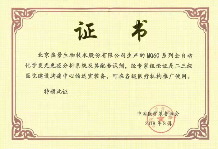 早在2018年,MQ60系列全自動化學(xué)發(fā)光免疫分析系統(tǒng)及其配套試劑通過中國醫(yī)學(xué)裝備協(xié)會組織國內(nèi)檢驗(yàn)、心內(nèi)和急診等領(lǐng)域知名專家技術(shù)論證,一致認(rèn)為該設(shè)備滿足急診對高質(zhì)量檢測結(jié)果的要求,性能穩(wěn)定可靠,操作簡單快速,符合質(zhì)控要求,不依賴其它設(shè)備或繁瑣前處理,可對各類樣品進(jìn)行檢測,滿足二三級醫(yī)院建設(shè)胸痛中心的要求,適合各級醫(yī)療機(jī)構(gòu)推廣應(yīng)用。